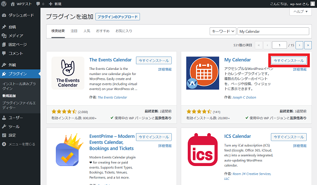 My CalendarはWordPressのプラグイン一覧画面より新規追加からインストールできます。