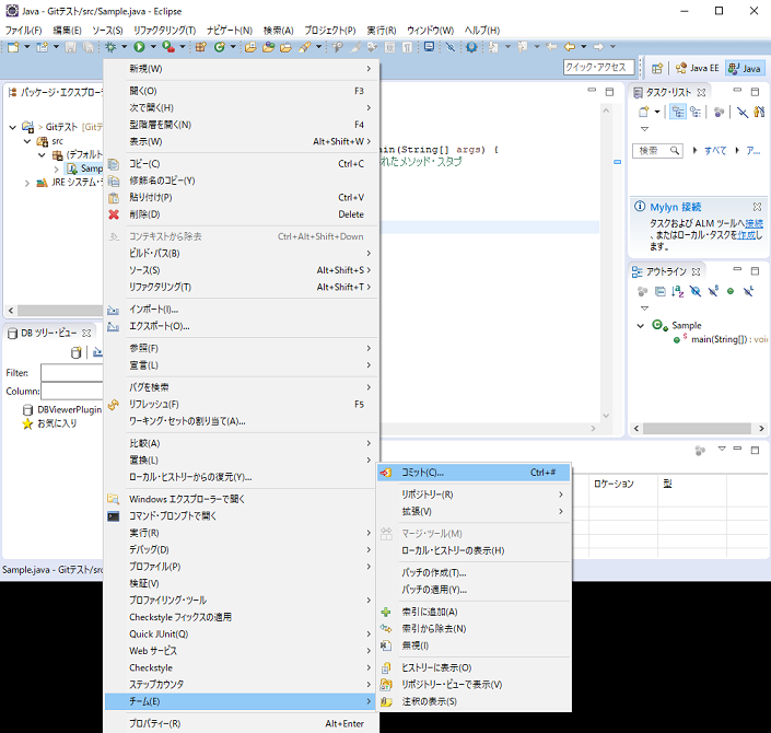 プロジェクトを選択して右クリックして、チーム>コミットを選択して、コミット画面を表示して、メッセージを入力して、コミットおよびプッシュをクリックします。